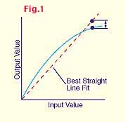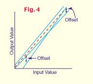 Non-linearity makes up the bulk of sensor inaccuracies. It can be described as the maximum difference between the measured data and the data as approximated by a best straight-line equation of the recorded data. It is generally expressed as a percentage of full scale (See Figure 1). Full scale is the entire range of the sensing device. For example, a manufacturer may indicate that his sensing device has a non-linearity of ±0.5%. If we use an example of a pressure transmitter that has a range of 0 to 100 psi, then the full scale of that pressure transmitter would be100 psi. The maximum error at any measured point from actual conditions will be no more than ±0.5 psi. So considering non-linearity only, we can say that this device has an accuracy of ±0.5% FS (full scale) or a maximum error of 0.5 psi at any point in the 0 to 100 psi range.