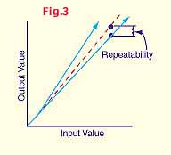 Repeatability is similar to hysteresis with the exception that we are now measuring the maximum difference in data points when the device is ramped multiple times in the same direction (See Figure 3). If we are told that the repeatability of our pressure transmitter is ±0.35% of FS, we can put together a complete picture of accuracy. The defined accuracy of our pressure transmitter is the combination of non-linearity, hysteresis, and repeatability. In our case this sample pressure product would have an accuracy (due to non-linearity, hysteresis, and repeatability) of ±1.0% FS.
