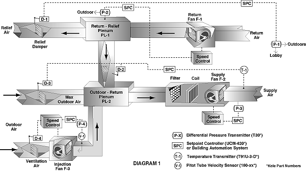 The outdoor ventilation air is handled by the small constant volume injection fan (F-3). A pitot tube velocity sensor (V-1) in the high velocity discharge of this fan, maintains a constant flow of air by controlling the fan speed to meet the ventilation requirements of ASHRAE Standard 62. If the need for more or less ventilation air changes, the velocity can be reset providing the fan has been liberally sized. Parallel blade low leakage damper (D-4) is closed when fan (F-3) is off.