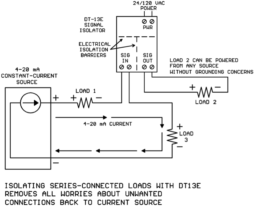 Multiple loads inserted in a 4-20 mA current loop must be connected in series. If the series-connected loads are powered devices, “sneak paths” between the load power supply connections and the current source may misdirect the 4-20 mA so that not all the loads receive the signal. Isolating the series-connected load with a DT-13E or similar signal isolator will solve this problem.