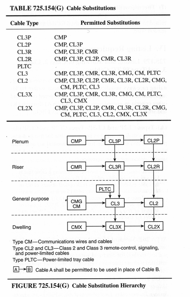 Now let’s have a look at wiring in air handling spaces and chases. If not in metal conduit, there is a wide range of choices for low-voltage cabling – plenum and chase ratings have been around much longer than UL 2043, so manufacturers have made listed cables for every application. The important thing to take away from this article is that there are two very different ratings available. Plenum rating is one, and chase (riser) rating is another. Be certain that your cable is marked and listed for use in plenums and/or risers as appropriate. Substitutions may be made according to Table 725.154(G) in the NEC. In general, plenum rated cables can be used in risers, but not the other way around. Kele’s Model CBL carries both CL3R and CLP3 ratings and thus can be substituted for almost any application. Here’s a copy of Table 725.154(G), courtesy of the National Fire Protection Association. It illustrates the hierarchy of Class 2 and Class 3 cable types allowed in various spaces:
