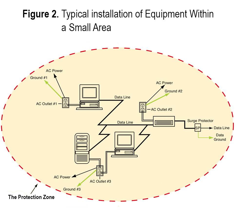 The protection zone is an imaginary circle drawn around and encompassing electronic equipment items that are located in close proximity to each other (see Figure 1). Everything passing through the imaginary circle should be commonly grounded and should have surge protection.