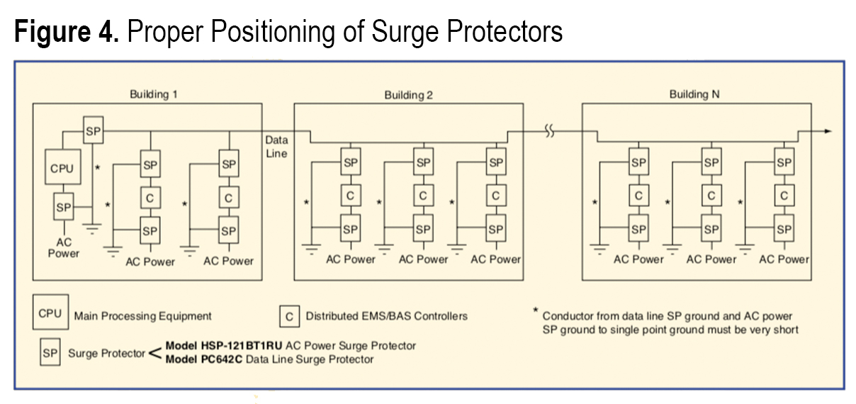 To properly configure surge protection on a multi-building, multi-drop system (see Figure 4), connect the surge protector on each controller drop so that the protector is not in series with the main data line. When connected in this manner, no more than two surge protectors are connected in series. Using the Protection Zone Concept, locate the data line surge protectors within the protection zone window along with an AC service outlet surge protector for each respective controller. Remember to keep the ground connections to the single point ground very short.