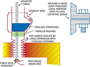To contain the pressures of an explosion, these enclosures are made from heavy cast steel or cast aluminum. To cool escaping gases, flanged enclosures have extra-wide flanges that are ground to a smooth finish and tight tolerance – thus yielding a very thin, very long path to the outside as shown in the illustration. Enclosures with threaded covers (and threaded connections to either type of enclosure) produce the same effect by virtue of the long, narrow path through the threads. As the hot gases from an internal explosion pass through these long, narrow channels, they give up heat to the metal and their pressure is reduced. These two effects team up to lower the temperature of the gases to a safe level before they can come in contact with the atmosphere surrounding the enclosure.