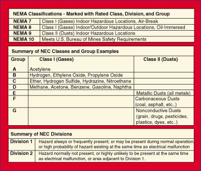 So where can these types of enclosures be used? As usual in our industry, there are no easy answers! Each explosion proof enclosure will be listed or labeled for use in a particular environment as defined in the National Electrical Code (NEC) or IEC Standards. In turn, the hazardous area itself must be classified according to the same standards. The enclosure must have a listing that meets or exceeds the classification of the area in which it is to be used. In the NEC, considerations are Class, Division, and Group as shown in the table. IEC standards use different code letters from the NEC but generally follow the same logic.
