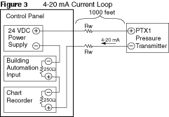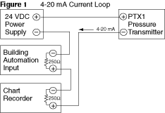 Looking back to Figure 1 shows that the building automation input is 250 ohms and the chart recorder adds 250 ohms. The total load of 500 ohms is within the 650 ohm capability of the PTX1 with a 24 VDC supply.
