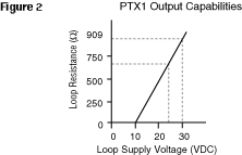 A quick study of the graph shows that when using a 10 VDC power supply, the PTX1 can support a maximum load of zero ohms! In other words, the PTX1 requires 10 VDC just to power its internal electronics (power supply overhead). For the transmitter to drive its 4-20 mA signal through any load at all, the power supply must be increased above the 10 VDC overhead required by the PTX1. As indicated by the graph, a 30 VDC supply will allow the transmitter to handle over 900 ohms of load in the loop. At 24 VDC the transmitter is rated for 650 ohms.