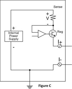 Another method used to generate a 4-20 mA signal puts the sensing and regulating electronics between the internal loop power supply and the analog output “I +” terminal. The “I -” terminal is connected to circuit “ground” (See Figure C). With this method, the “I+” terminals carry the different current values for each loop and, therefore, must be isolated from each other. Since all of the output “I-” terminals are electrically the same, they can be connected together. They may or may not be connected to “ground” depending on the manufacturer’s specifications. A controller using this method to generate a 4-20 mA signal is commonly called “current sourcing.”