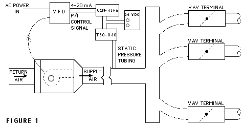 This control system will provide very smooth, precise static pressure control in the discharge duct. It will also save energy since the fan will use only as much horsepower as required to maintain the setpoint pressure. In this example the pressure is adjusted with the setpoint potentiometer on the UCM-420A. This pressure could also be controlled by a remote potentiometer or an analog or pulse width signal from a BAS controller.
