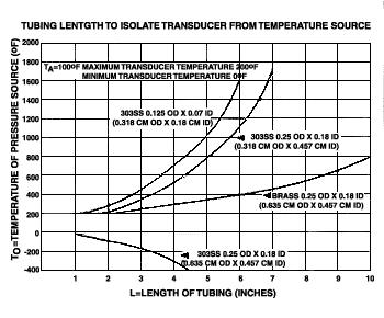 The curves on the chart below show how you can limit the temperature at the transducer to a range of 0°F (-17.8°C) to 200°F (93.3°C ) for fluid temperatures between -400°F (-204.4°C) and 1700°F (926°C). The chart shows the various tubing lengths, sizes, and materials you can use.