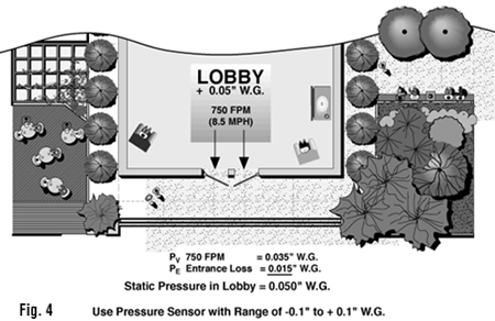 A lobby pressure of 0.05″ W.G. enables the door closers to operate in compliance with ADA and ANSI and still provide a positive pressure in the lobby as shown in Fig. 4. It also generates a velocity of approximately 750 ft per minute through any door opening. This velocity is high enough to prevent infiltration and still not be objectionable to tenants.