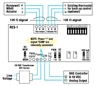 An Example: An existing Honeywell M945 valve actuator is to be controlled by a 0-10 VDC analog output signal from a new BAS controller using a standard RES-1E transducer with 135 ohm output. The analog output from the BAS controller has been programmed to vary based on room temperature. As the controller output increases, the resistance between the RES-1E terminals “R” and “B” will increase proportionally from approximately 2 ohms toward 135 ohms; the resistance between terminals “R” and “W” will decrease from 135 ohms towards approximately 2 ohms. As the controller output decreases, the resistance between “R” and “B” will decrease and the resistance between “R” and “W” will increase. The actuator will respond accordingly to the changes in resistance. As shown in the wiring diagram, an existing 135 ohm thermostat has been connected to the RES-1E. When 24V power is interrupted at the RES-1E power terminals, the fail-safe mode internally connects the RES-1E “OUTPUT” terminals to the “FALLBACK POT” terminals allowing the existing thermostat to be used for backup control.