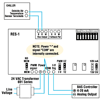 An Example: A 4-20 mA analog output signal from a BAS controller is to reset the LWT setpoint of a chiller that is normally reset from a resistive OAT sensor wired directly to the chiller. The first step is to determine the desired setpoint reset range and the equivalent resistance range of the OAT sensor. This information should be obtained from the chiller manufacturer. If the sensor is a thermistor, the setpoint reset range should be as narrow as possible to minimize non-linearity. The RES-1E can be ordered with a standard range of 135, 500 or 1000 ohms or it can be ordered with a custom range to match the application.